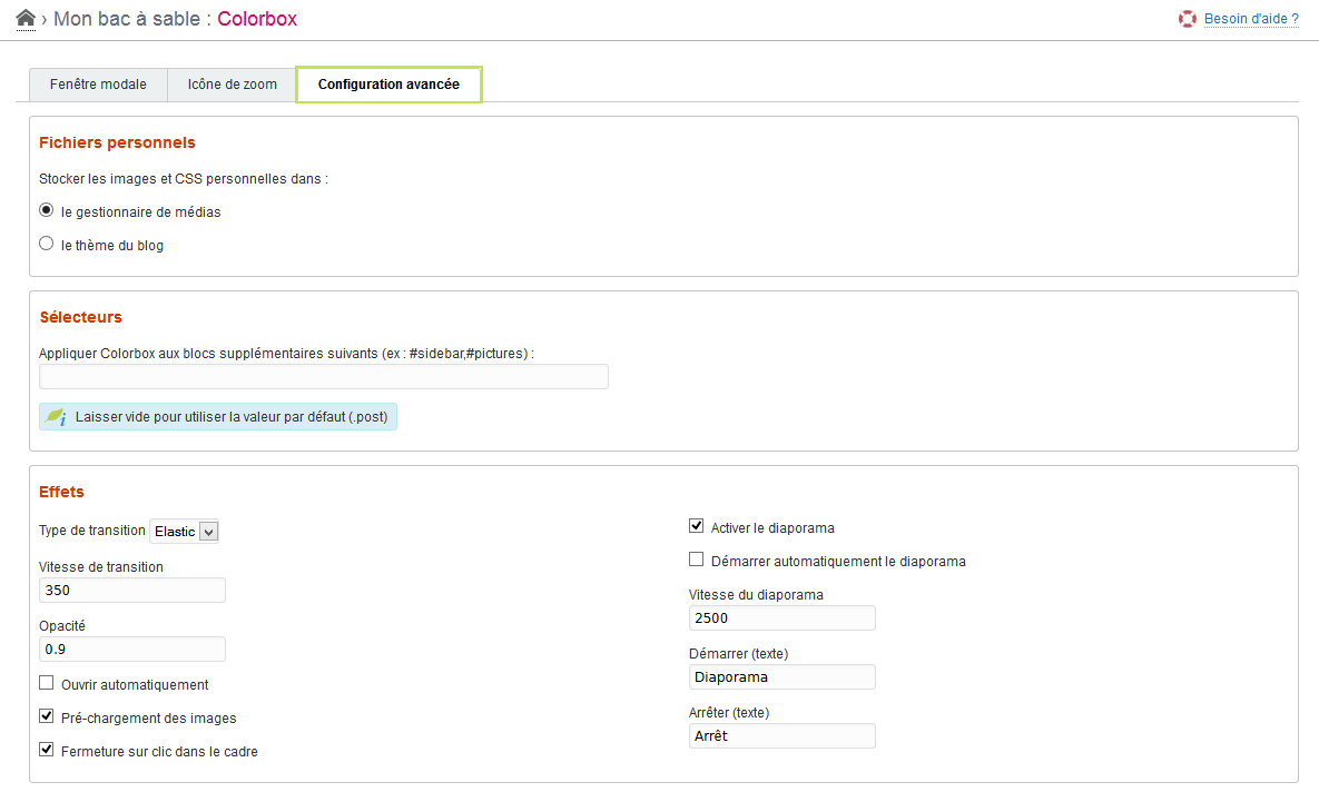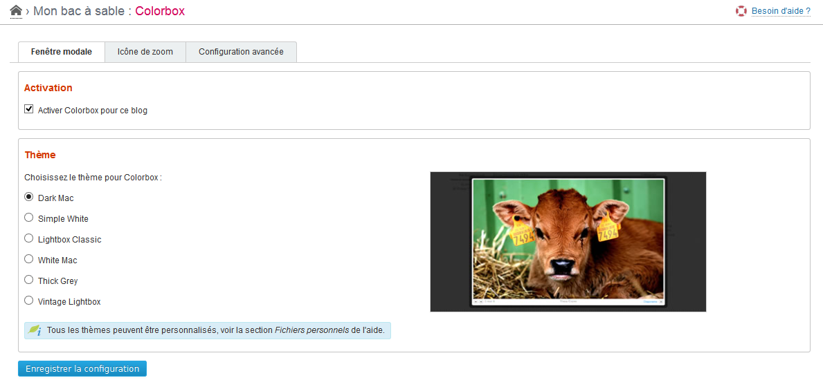 Ce plugin permet de configurer l’aspect de la fenêtre modale dans laquelle sont agrandies les images de vos billets. Il est basé sur le script Colorbox de Jack Moore, sous licence MIT.