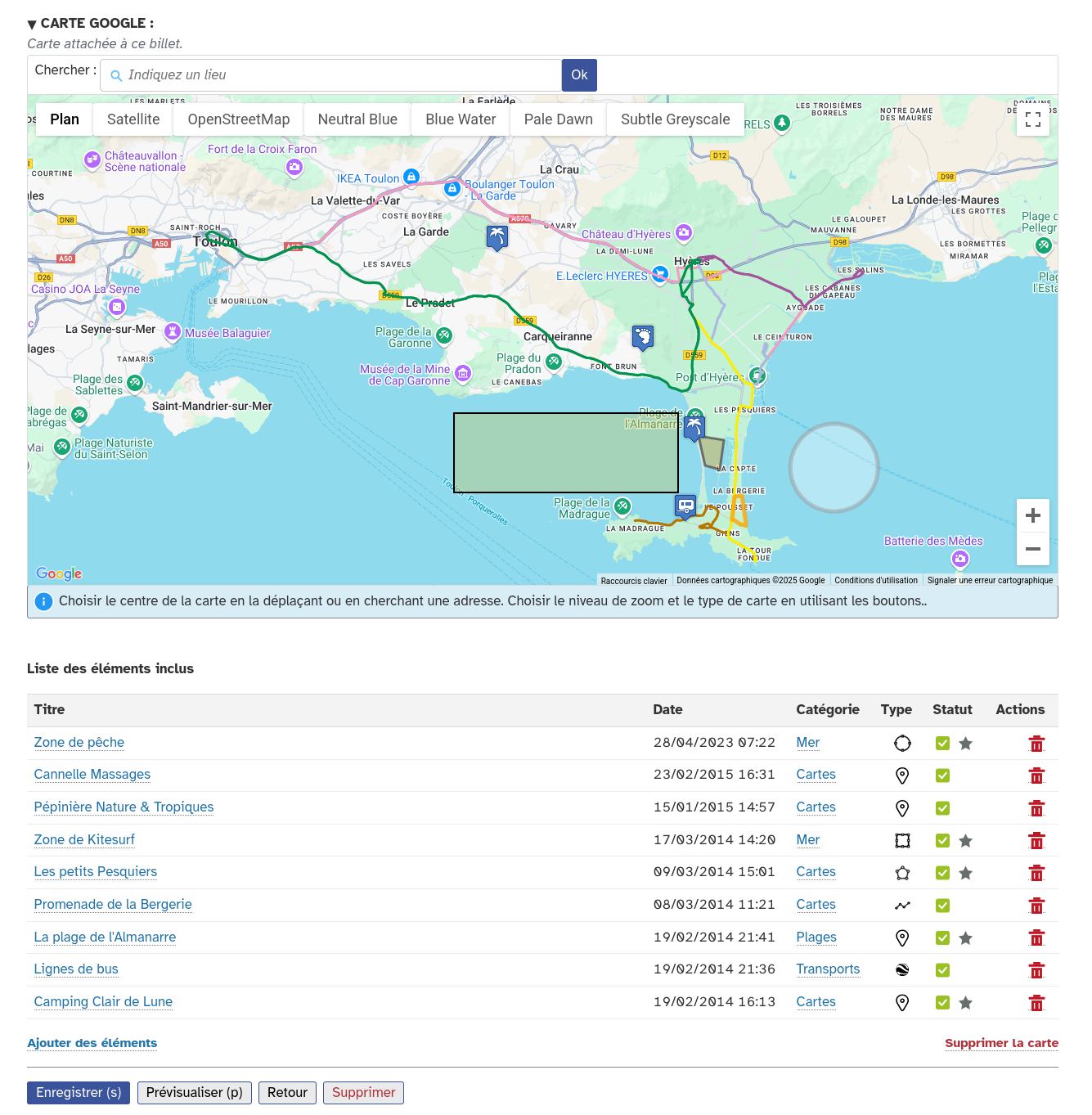 Il est ensuite possible d’associer une carte à un billet ou à une page, et d’y inclure un nombre quelconque d’éléments. Il est également possible d’insérer une carte n’importe où dans le blog grâce à une balise de template.